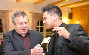 Der Supermagier unterhält kleinere Grüppchen direkt an den Tischen aus nächster Nähe.
